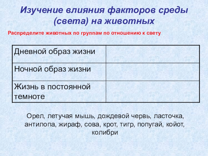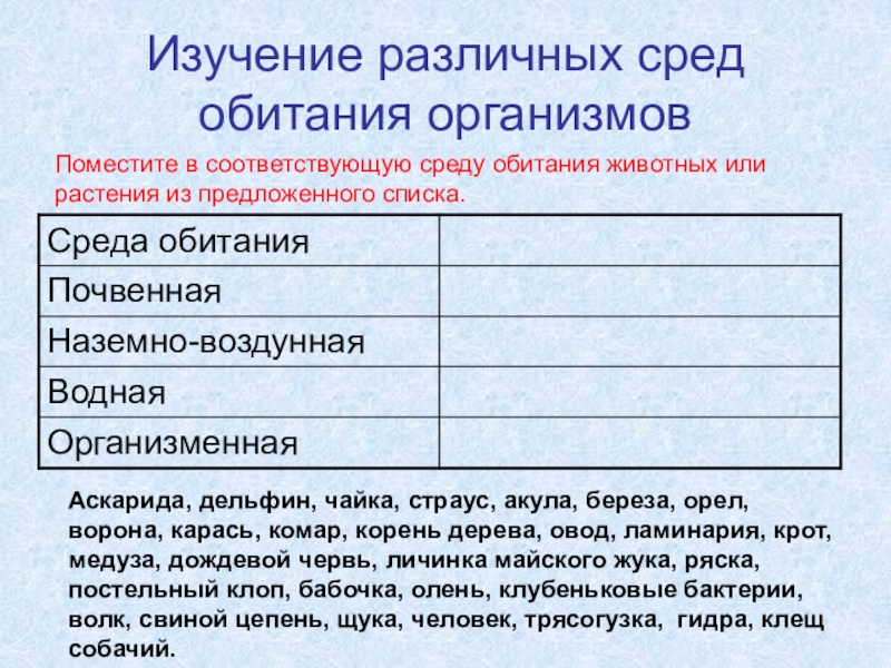 Поместите в соответствующую среду обитания животных или растения из предложенного списка.