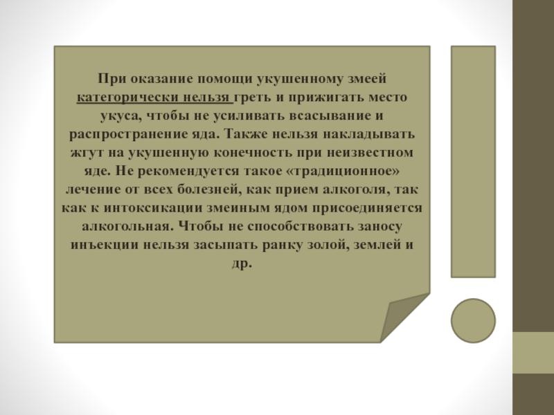 Выдавить первые капли крови из места укуса и отсосать ртом яд из ранки при отсутствии ссадин во рту. Отсасывание ртом нежелательно при укусах особо ядовитых змей (кобры, тайпаны, мамбы, гремучники, крайты. Лучше использовать импровизированные «банки», создавая в них вакуум при помощи зажигалки или спички