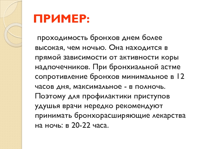 сопротивление бронхов минимальное в 12 часов дня, максимальное - в полночь. Поэтому для профилактики приступов удушья врачи нередко рекомендуют принимать бронхорасширяющие лекарства на ночь: в 20-22 часа.