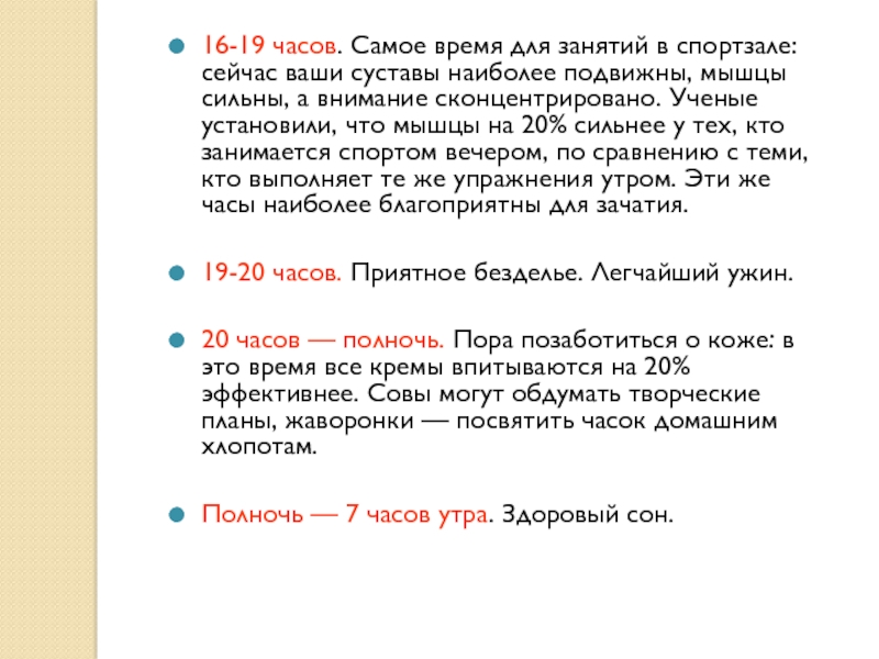 Слайд 1816-19 часов. Самое время для занятий в спортзале: сейчас ваши