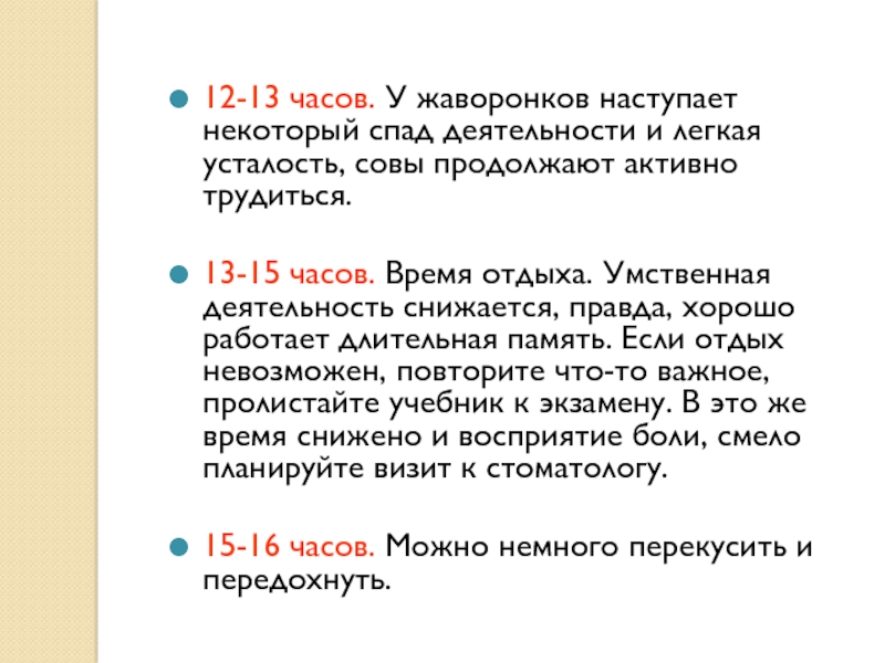 Слайд 1712-13 часов. У жаворонков наступает некоторый спад деятельности и легкая