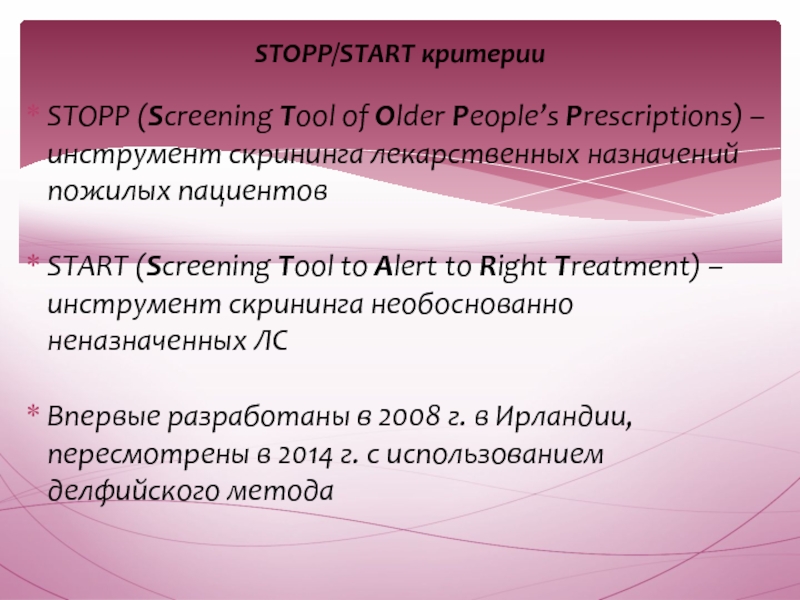 STOPP-START (STOPP – the Screening Tool of Older Persons Prescriptions, Рекомендации Национальной службы здравоохранения Великобритании, NHS, 2013, обновления 2015)