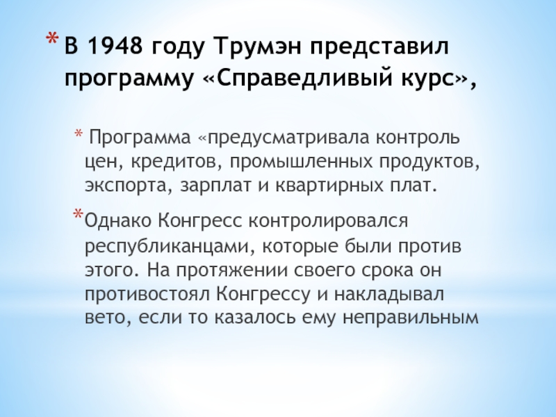 Слайд 11В 1948 году Трумэн представил программу «Справедливый курс»,