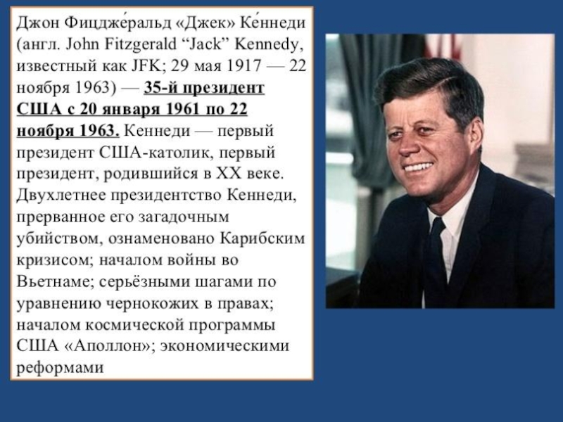 коммунизма. В то же время правительство Кеннеди начал реалистично оценивать свои возможности в мире, яснее осознавать социально-экономические факторы. Сам Кеннеди неоднократно подчеркивал необходимость проводить более гибкую и реалистичную внешнюю политику.Кеннеди выступал за улучшение отношений между США и СССР
