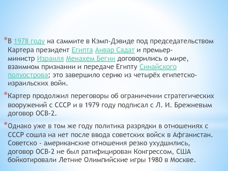 Однако уже в том же году политика разрядки в отношениях с СССР сошла на нет после ввода советских войск в Афганистан. Советско - американские отношения резко ухудшились, договор ОСВ-2 не был ратифицирован Конгрессом, США бойкотировали Летние Олимпийские игры 1980 в Москве.