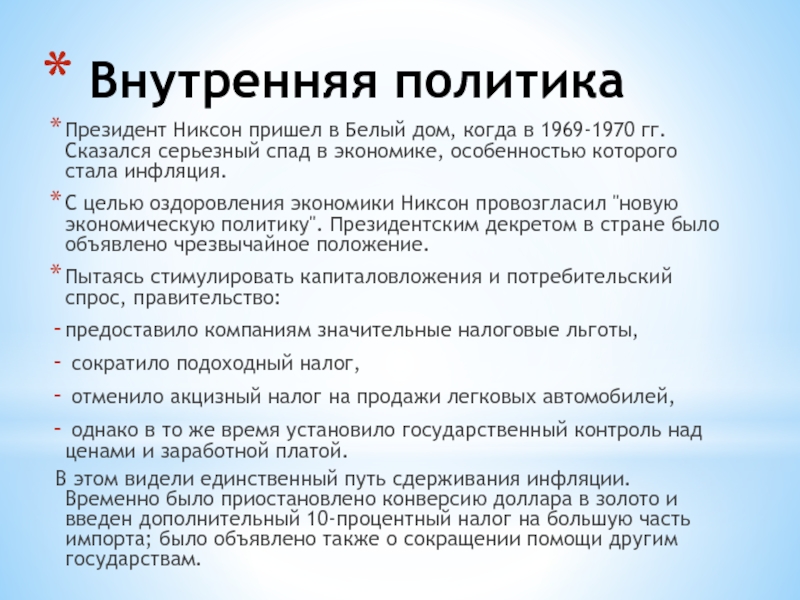 целью оздоровления экономики Никсон провозгласил "новую экономическую политику". Президентским декретом в стране было объявлено чрезвычайное положение.