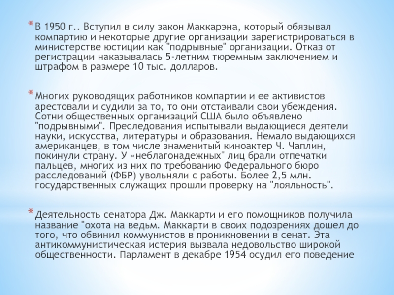 Слайд 10В 1950 г.. Вступил в силу закон Маккарэна, который обязывал