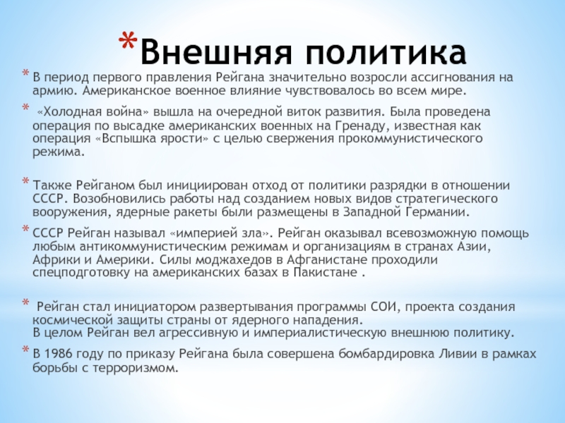 В целом Рейган вел агрессивную и империалистическую внешнюю политику.