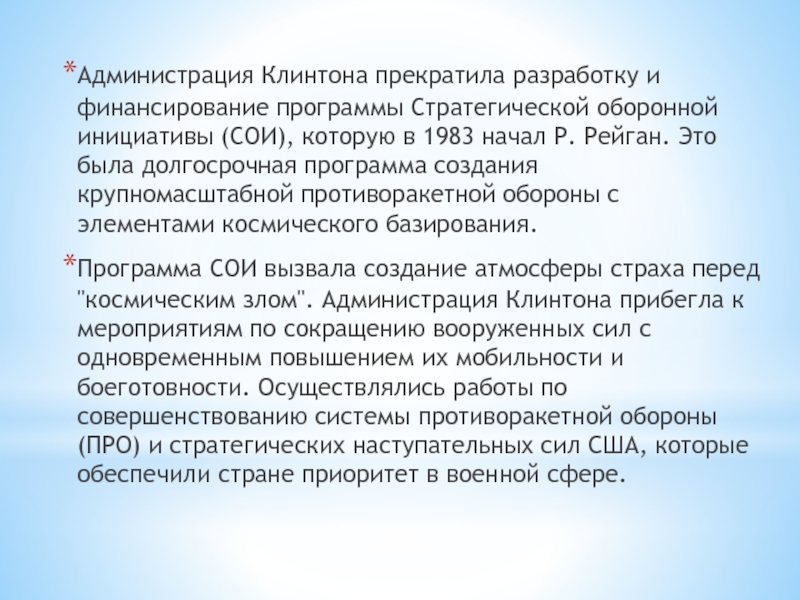 Слайд 49Администрация Клинтона прекратила разработку и финансирование программы Стратегической оборонной инициативы