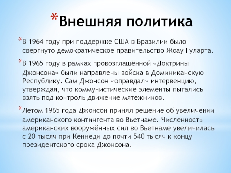 рамках провозглашённой «Доктрины Джонсона» были направлены войска в Доминиканскую Республику. Сам Джонсон «оправдал» интервенцию, утверждая, что коммунистические элементы пытались взять под контроль движение мятежников.