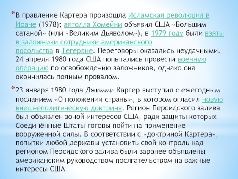 Слайд 35В правление Картера произошла Исламская революция в Иране (1978); аятолла Хомейни объявил США