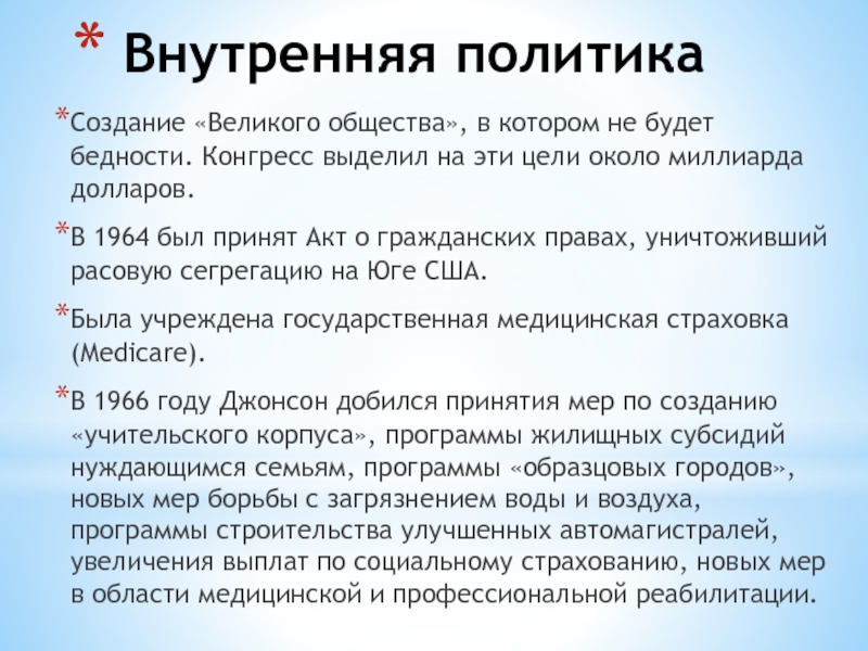 В 1966 году Джонсон добился принятия мер по созданию «учительского корпуса», программы жилищных субсидий нуждающимся семьям, программы «образцовых городов», новых мер борьбы с загрязнением воды и воздуха, программы строительства улучшенных автомагистралей, увеличения выплат по социальному страхованию, новых мер в области медицинской и профессиональной реабилитации.