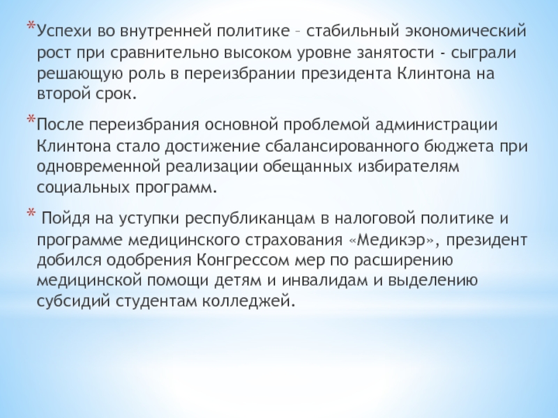 Пойдя на уступки республиканцам в налоговой политике и программе медицинского страхования «Медикэр», президент добился одобрения Конгрессом мер по расширению медицинской помощи детям и инвалидам и выделению субсидий студентам колледжей.