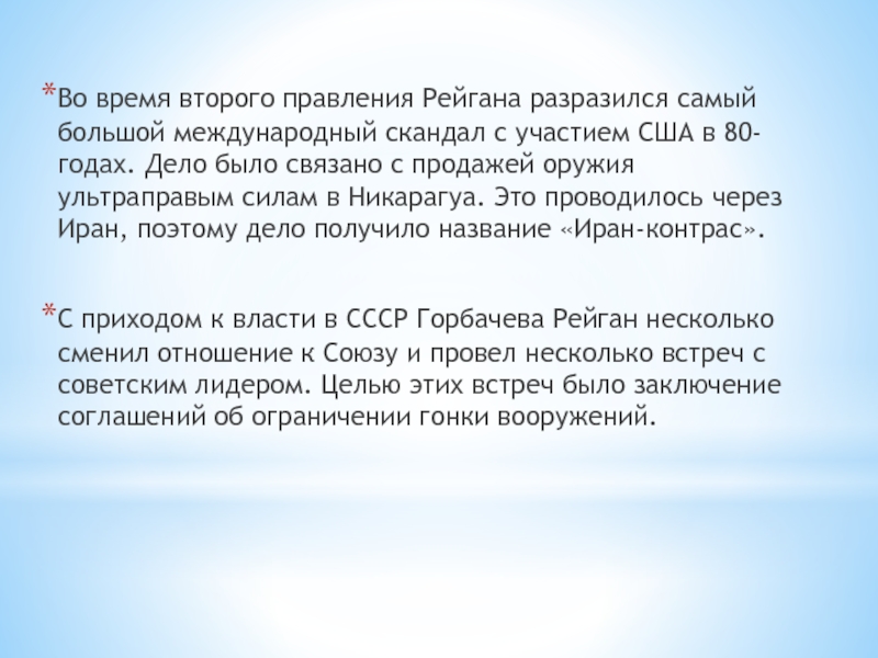 Слайд 40Во время второго правления Рейгана разразился самый большой международный скандал