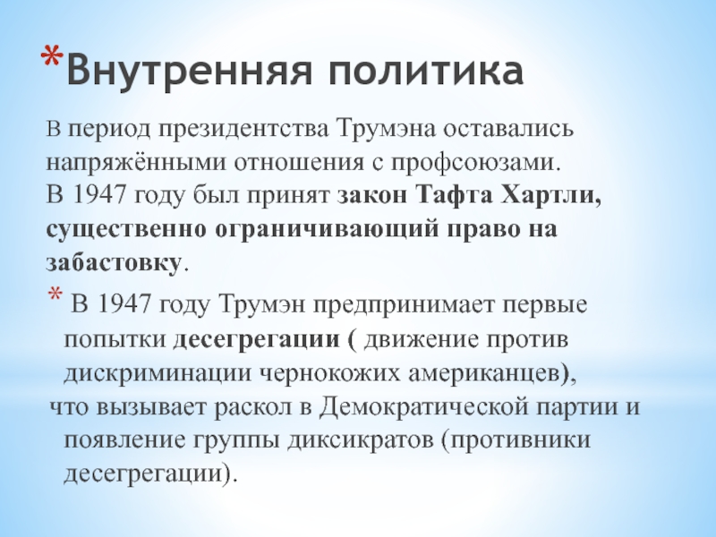 В 1947 году Трумэн предпринимает первые попытки десегрегации ( движение против дискриминации чернокожих американцев),
