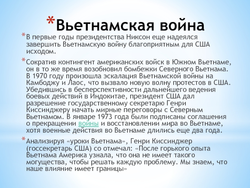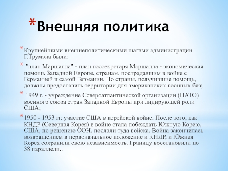 1950 - 1953 гг. участие США в корейской войне. После того, как КНДР (Северная Корея) в войне стала побеждать Южную Корею, США, по решению ООН, послали туда войска. Война закончилась возвращением в первоначальное положение и КНДР, и Южная Корея сохранили свою независимость. Границу восстановили по 38 параллели..
