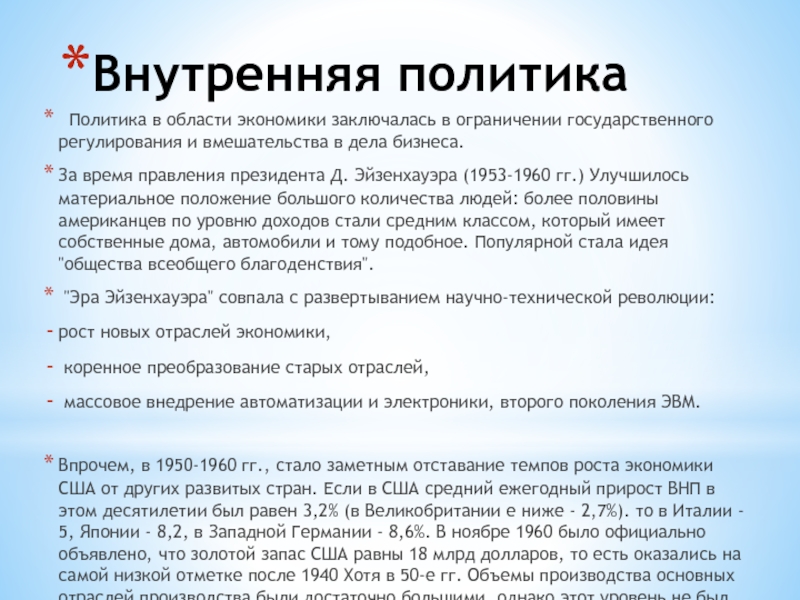 Д. Эйзенхауэра (1953-1960 гг.) Улучшилось материальное положение большого количества людей: более половины американцев по уровню доходов стали средним классом, который имеет собственные дома, автомобили и тому подобное. Популярной стала идея "общества всеобщего благоденствия".
