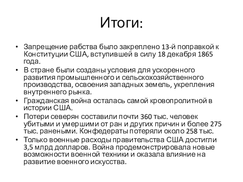 Итоги:Запрещение рабства было закреплено 13-й поправкой к Конституции США, вступившей в силу 18 декабря 1865 года.В стране были