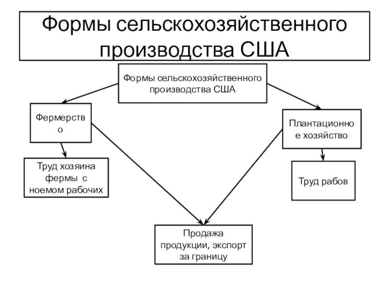 Формы сельскохозяйственного производства СШАТруд рабовТруд хозяина фермы с ноемом рабочихФермерствоПлантационное хозяйствоФормы сельскохозяйственного производства СШАПродажа продукции, экспорт за