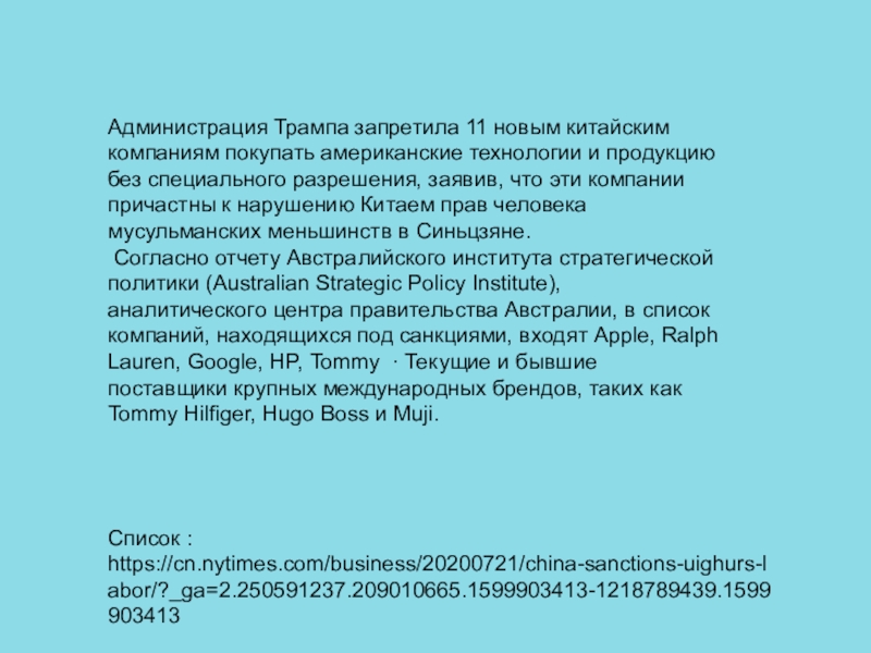 Список : https://cn.nytimes.com/business/20200721/china-sanctions-uighurs-labor/?_ga=2.250591237.209010665.1599903413-1218789439.1599903413