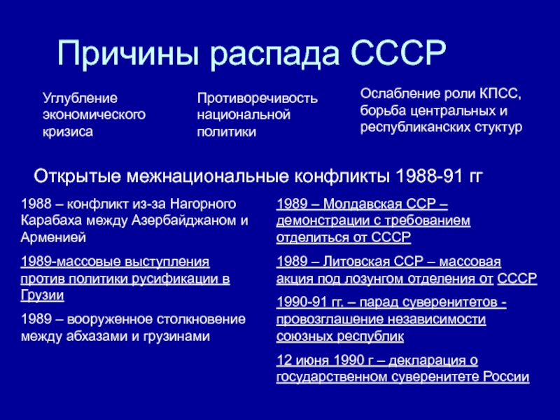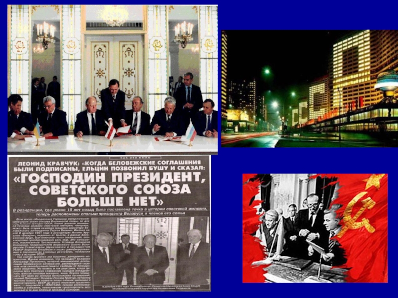 8 декабря 1991 г. лидеры России, Украины и Белоруссии (Б.Н. Ельцин, Л.М. Кравчук, С.С. Шушкевич) объявили о роспуске СССР и создании Содружества Независимых государств (СНГ) – «Беловежские соглашения».