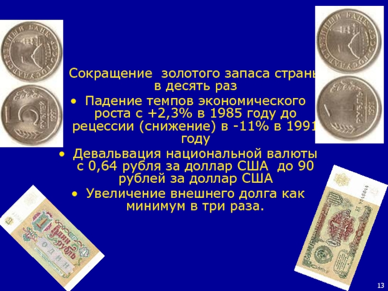 Слайд 13Сокращение золотого запаса страны в десять раз