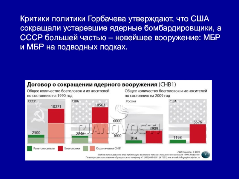 Слайд 37Критики политики Горбачева утверждают, что США сокращали устаревшие ядерные бомбардировщики,