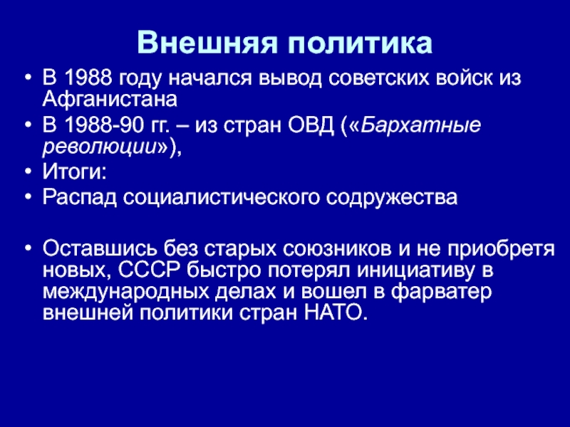 Оставшись без старых союзников и не приобретя новых, СССР быстро потерял инициативу в международных делах и вошел в фарватер внешней политики стран НАТО.