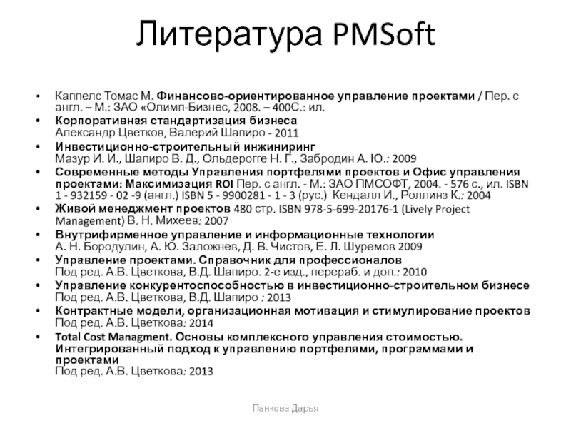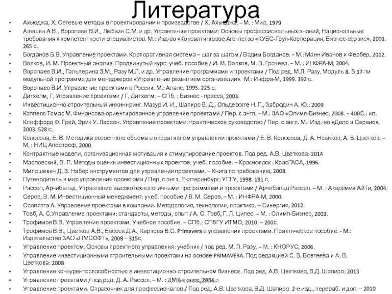 Воропаев В.И., Гальперина З.М., Разу М.Л. и др. Управление программами и проектами / Под ред. М.Л. Разу. Модуль 8. В 17-ти модульной программе для менеджеров «Управление развитием организации». М.: Инфра-М, 1999. 392 с.