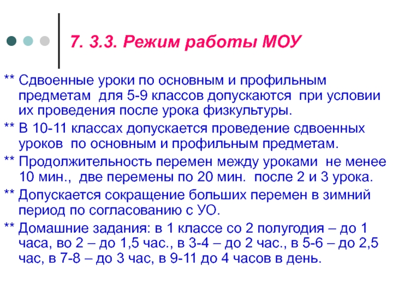 ** Домашние задания: в 1 классе со 2 полугодия – до 1 часа, во 2 – до 1,5 час., в 3-4 – до 2 час., в 5-6 – до 2,5 час, в 7-8 – до 3 час, в 9-11 до 4 часов в день.