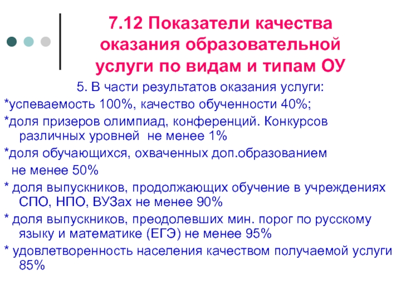 7.12 Показатели качества оказания образовательной услуги по видам и типам