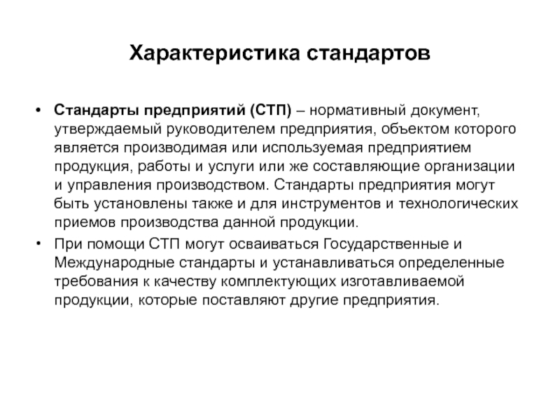 При помощи СТП могут осваиваться Государственные и Международные стандарты и устанавливаться определенные требования к качеству комплектующих изготавливаемой продукции, которые поставляют другие предприятия.
