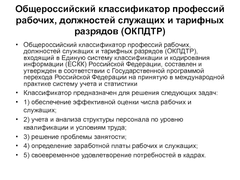 Слайд 24Общероссийский классификатор профессий рабочих, должностей служащих и тарифных разрядов (ОКПДТР)