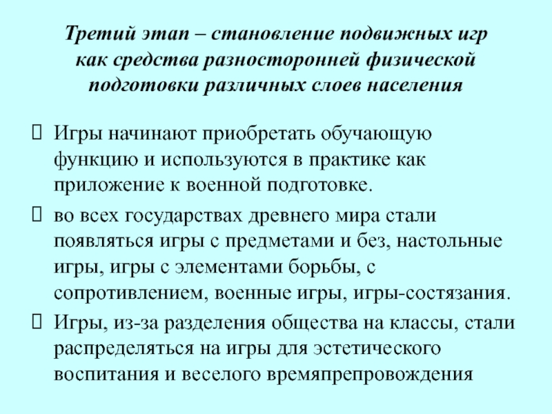 во всех государствах древнего мира стали появляться игры с предметами и без, настольные игры, игры с элементами борьбы, с сопротивлением, военные игры, игры-состязания.