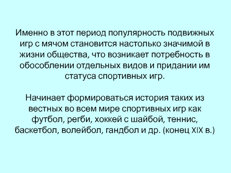 Начинает формироваться история таких известных во всем мире спортивных игр как футбол, регби, хоккей с шайбой, теннис, баскетбол, волейбол, гандбол и др. (конец XIX в.)