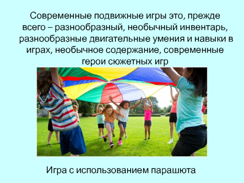 Слайд 67Современные подвижные игры это, прежде всего – разнообразный, необычный инвентарь,