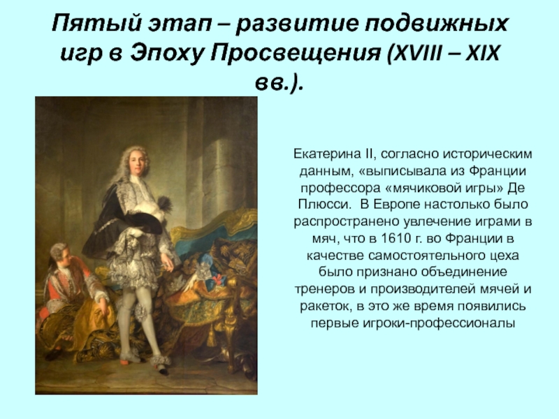 Слайд 44Пятый этап – развитие подвижных игр в Эпоху Просвещения (XVIII