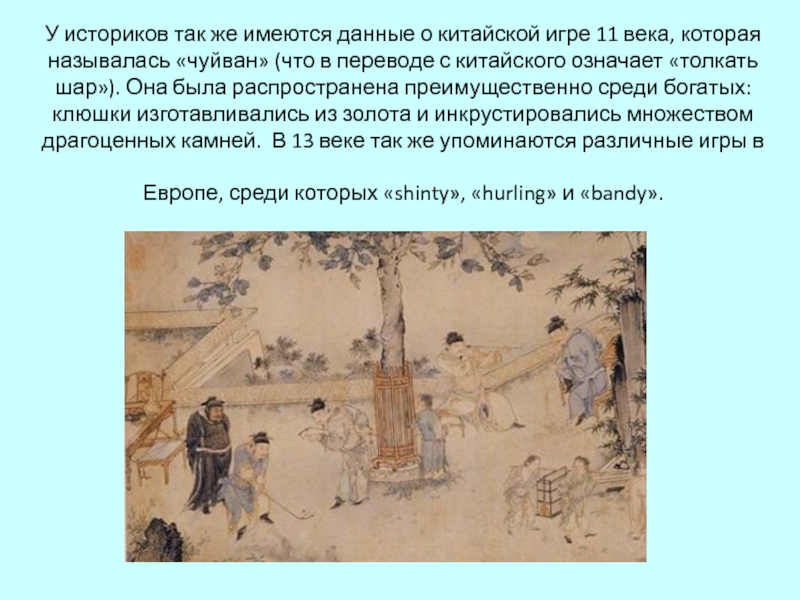 «толкать шар»). Она была распространена преимущественно среди богатых: клюшки изготавливались из золота и инкрустировались множеством драгоценных камней. В 13 веке так же упоминаются различные игры в Европе, среди которых «shinty», «hurling» и «bandy».