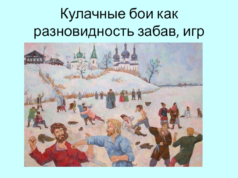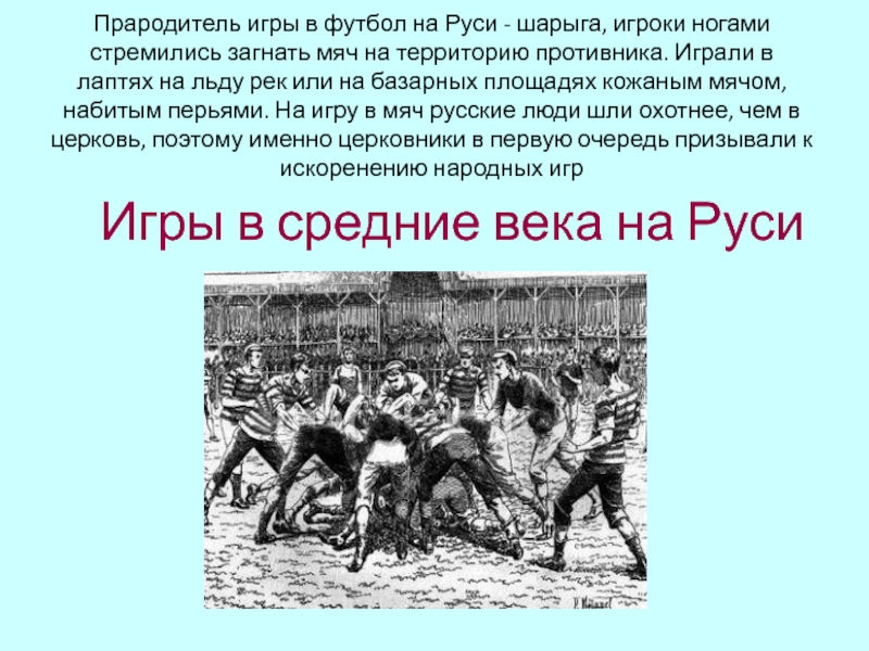 льду рек или на базарных площадях кожаным мячом, набитым перьями. На игру в мяч русские люди шли охотнее, чем в церковь, поэтому именно церковники в первую очередь призывали к искоренению народных игр
