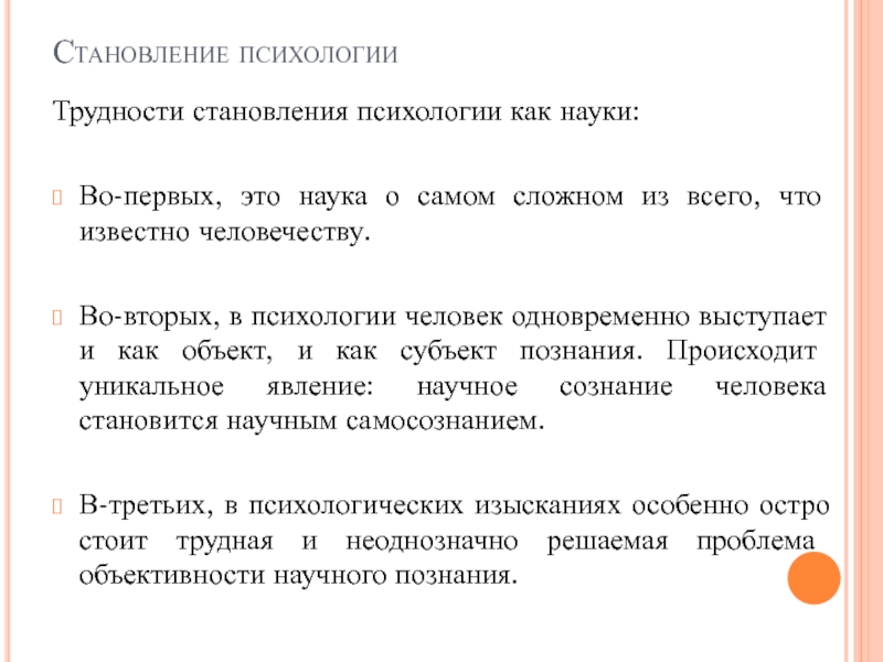 В-третьих, в психологических изысканиях особенно остро стоит трудная и неоднозначно решаемая проблема объективности научного познания.