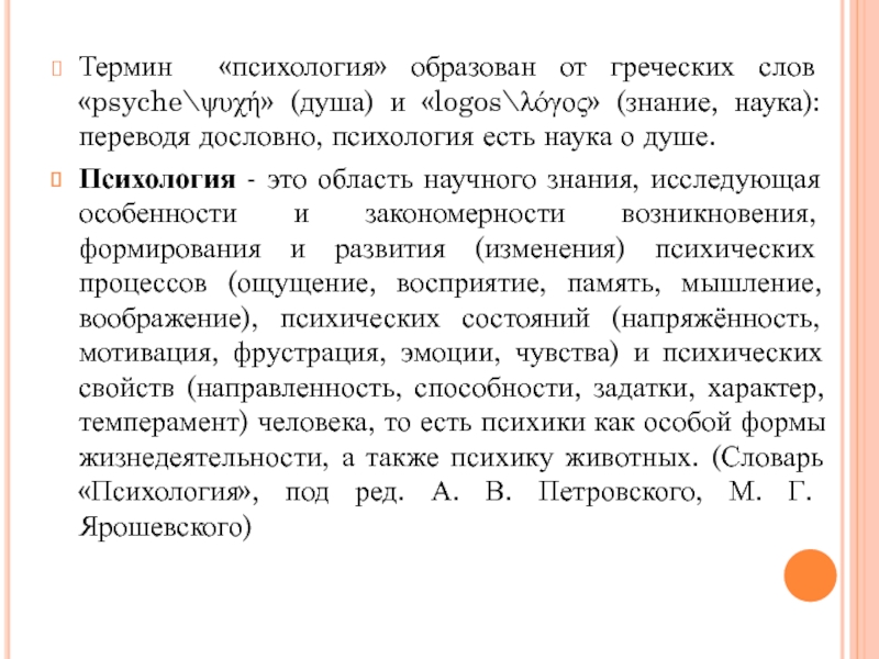 - это область научного знания, исследующая особенности и закономерности возникновения, формирования и развития (изменения) психических процессов (ощущение, восприятие, память, мышление, воображение), психических состояний (напряжённость, мотивация, фрустрация, эмоции, чувства) и психических свойств (направленность, способности, задатки, характер, темперамент) человека, то есть психики как особой формы жизнедеятельности, а также психику животных. (Словарь «Психология», под ред. А. В. Петровского, М. Г. Ярошевского)