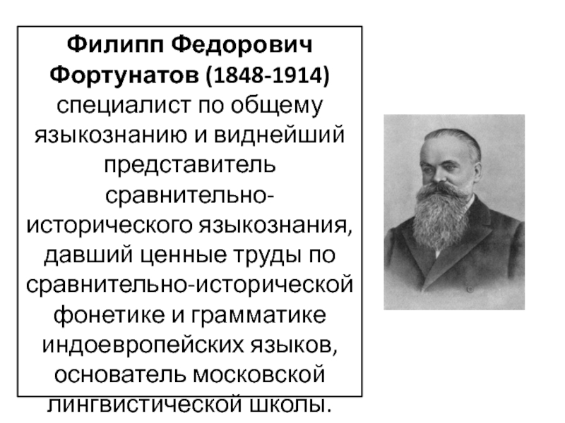 Филипп Федорович Фортунатов (1848-1914) специалист по общему языкознанию и виднейший представитель сравнительно-исторического языкознания, давший ценные труды по сравнительно-исторической фонетике и грамматике индоевропейских языков, основатель московской лингвистической школы.