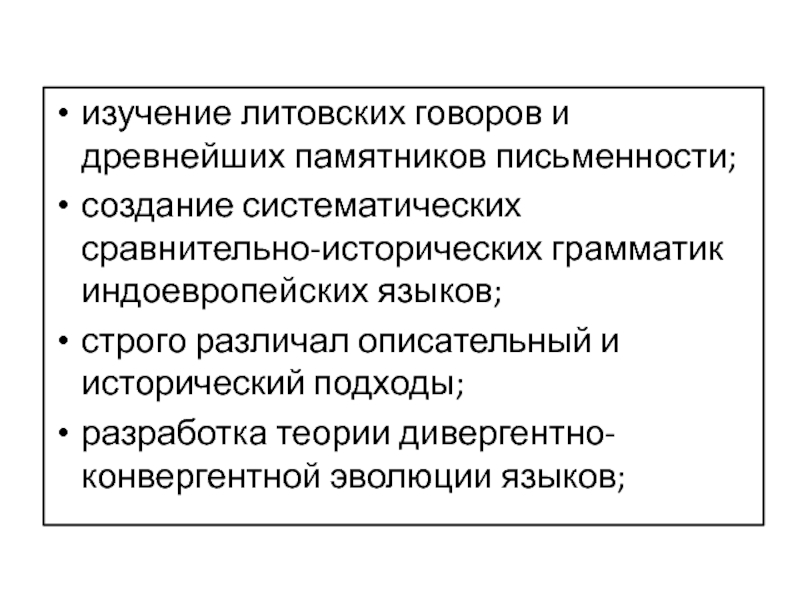 изучение литовских говоров и древнейших памятников письменности; создание систематических сравнительно-исторических грамматик индоевропейских языков;строго различал описательный и исторический подходы;разработка теории