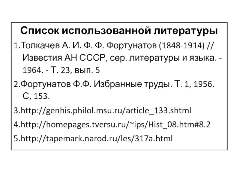 Список использованной литературы1.Толкачев А. И. Ф. Ф. Фортунатов (1848-1914) // Известия АН СССР, сер. литературы и языка.