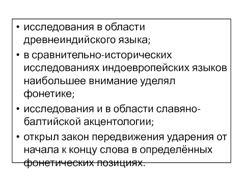 исследования в области древнеиндийского языка;в сравнительно-исторических исследованиях индоевропейских языков наибольшее внимание уделял фонетике;исследования и в области славяно-балтийской
