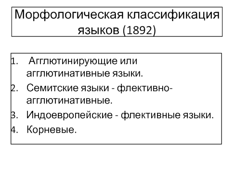 Морфологическая классификация языков (1892) Агглютинирующие или агглютинативные языки. Семитские языки - флективно-агглютинативные. Индоевропейские - флективные языки.Корневые.
