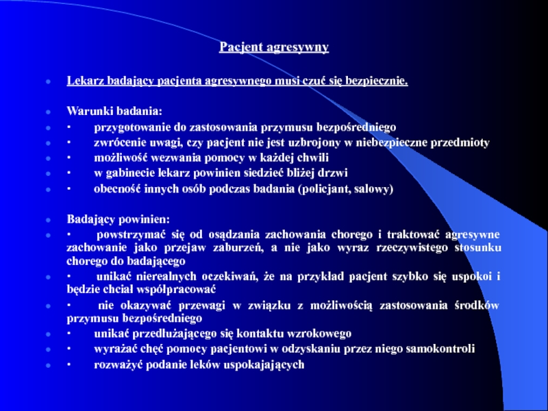 · powstrzymać się od osądzania zachowania chorego i traktować agresywne zachowanie jako przejaw zaburzeń, a nie jako wyraz rzeczywistego stosunku chorego do badającego