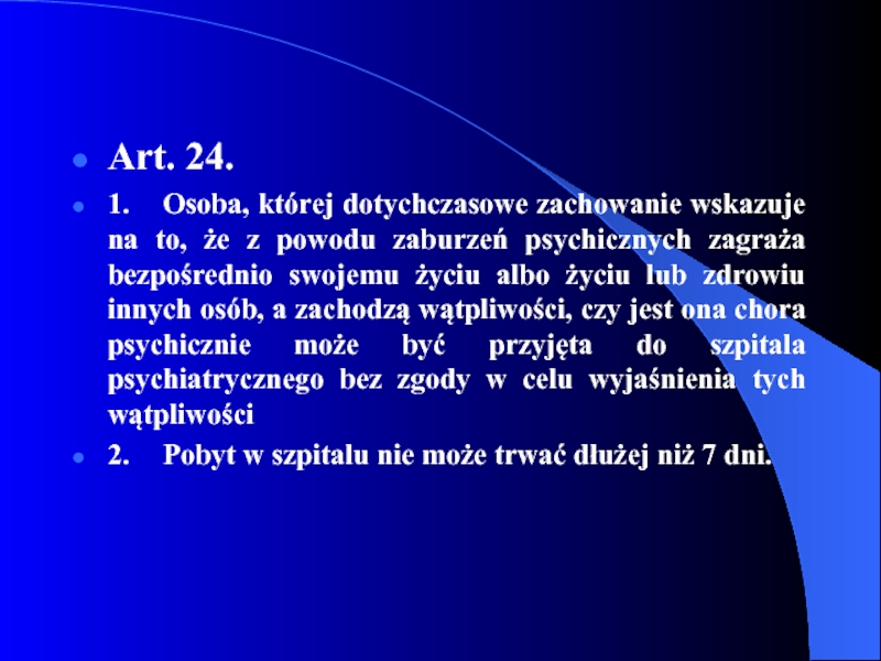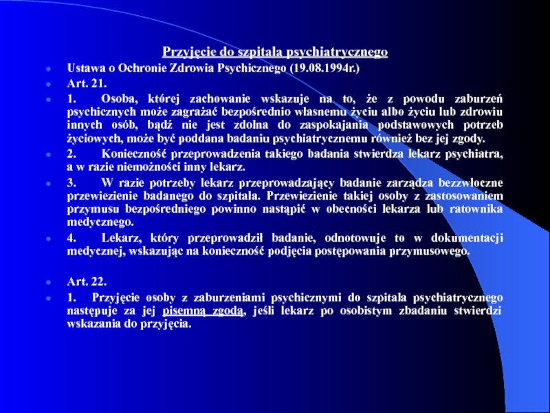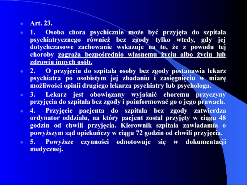 4. Przyjęcie pacjenta do szpitala bez zgody zatwierdza ordynator oddziału, na który pacjent został przyjęty w ciągu 48 godzin od chwili przyjęcia. Kierownik szpitala zawiadamia o powyższym sąd opiekuńczy w ciągu 72 godzin od chwili przyjęcia.