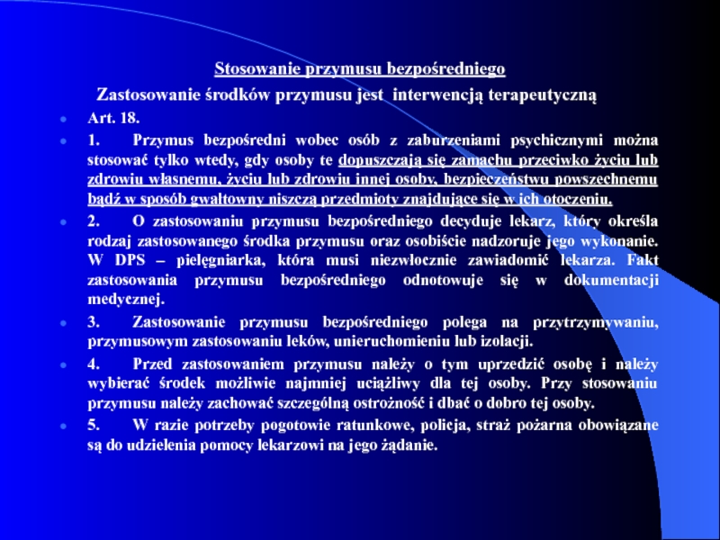 2. O zastosowaniu przymusu bezpośredniego decyduje lekarz, który określa rodzaj zastosowanego środka przymusu oraz osobiście nadzoruje jego wykonanie. W DPS – pielęgniarka, która musi niezwłocznie zawiadomić lekarza. Fakt zastosowania przymusu bezpośredniego odnotowuje się w dokumentacji medycznej.