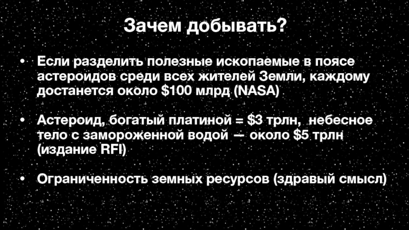 = $3 трлн, небесное тело с замороженной водой — около $5 трлн (издание RFI)Ограниченность земных ресурсов (здравый смысл)